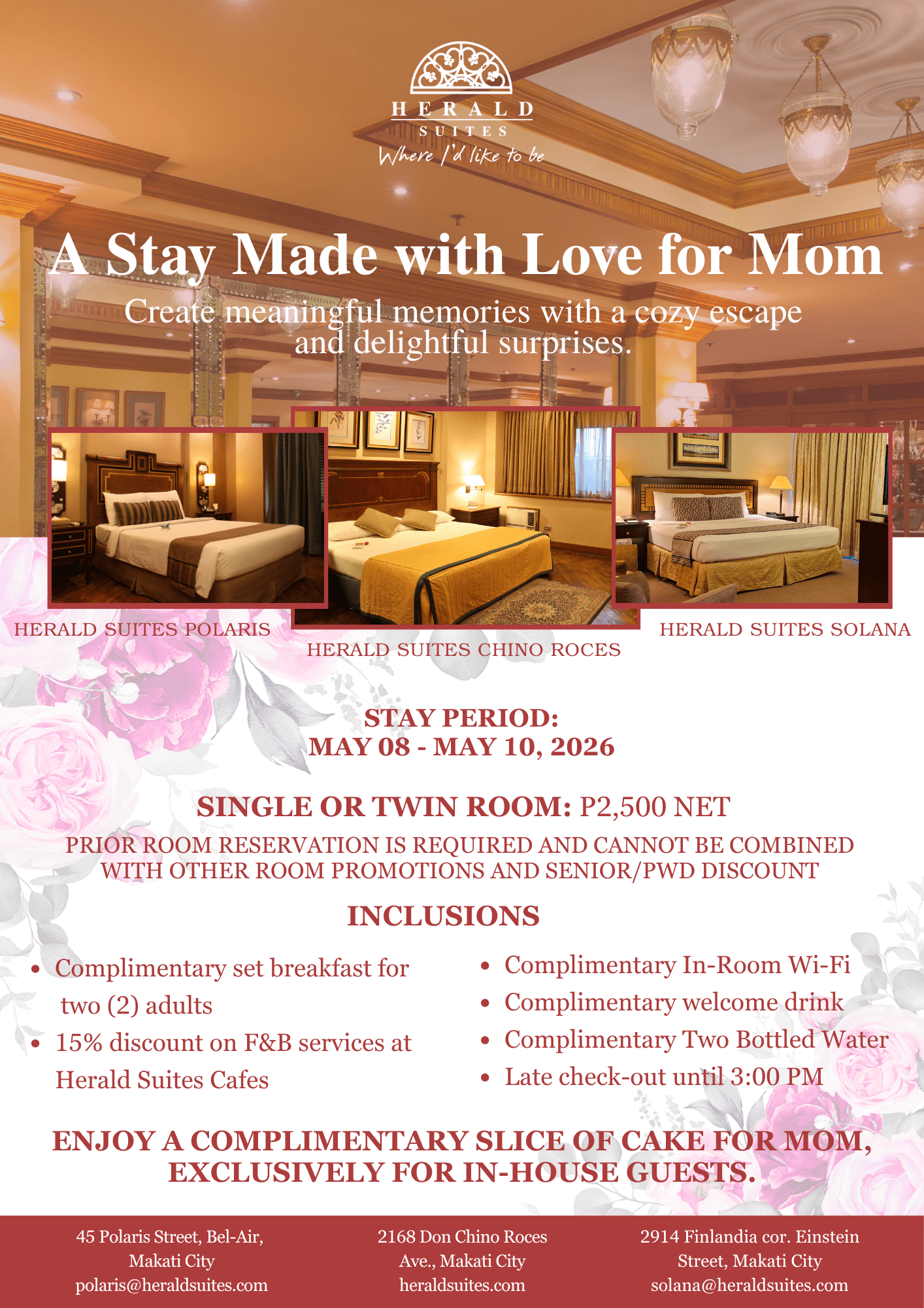 Two other sister properties located in Makati City offering their own distinct characteristics and atmosphere are: Herald Suites Polaris and Herald Suites Solana.